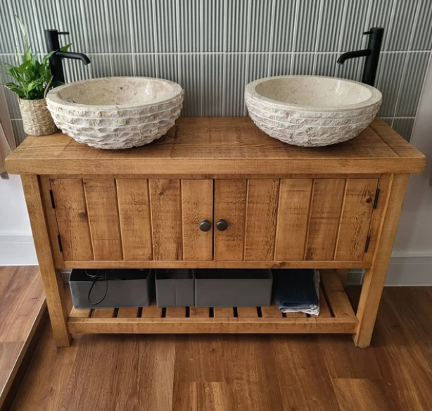 Design elegante e funcional com linhas simples e acabamento rústico. Ideal para lavatórios de pousar e arrumação adicional. Construído artesanalmente em madeira maciça para máxima durabilidade e carácter.